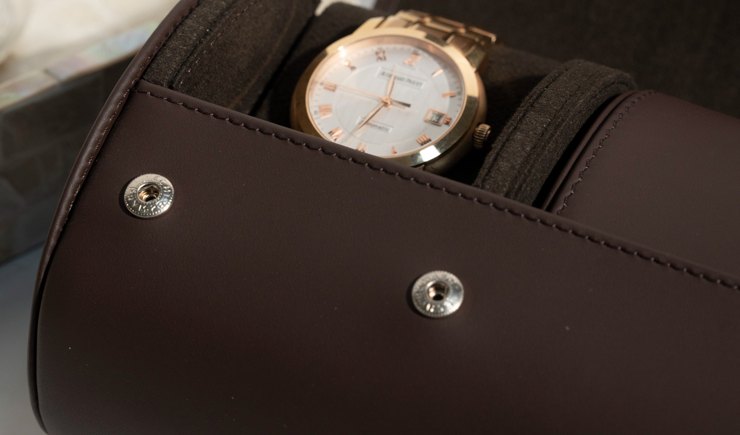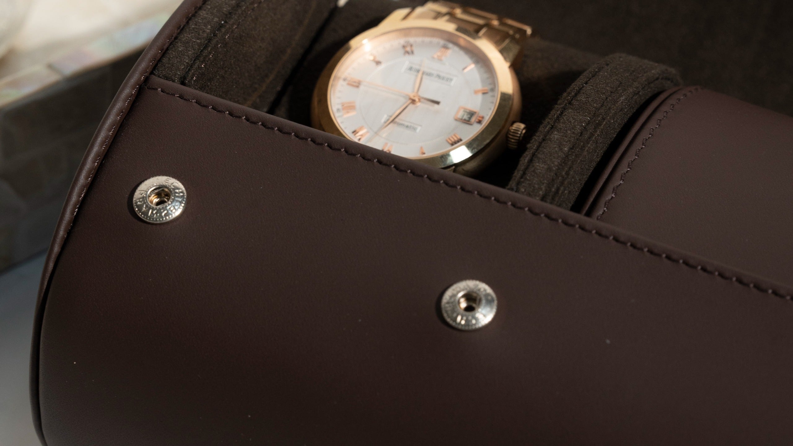 Handcrafted in Europe from premium tanned leather, it combines timeless craftsmanship with modern utility. Inside, compressible M-shaped cushions ensure a secure fit, protecting your timepiece with care. Our removable single watch pod is thoughtfully designed with an integrated ring holder to enhance functionality on-the-go.