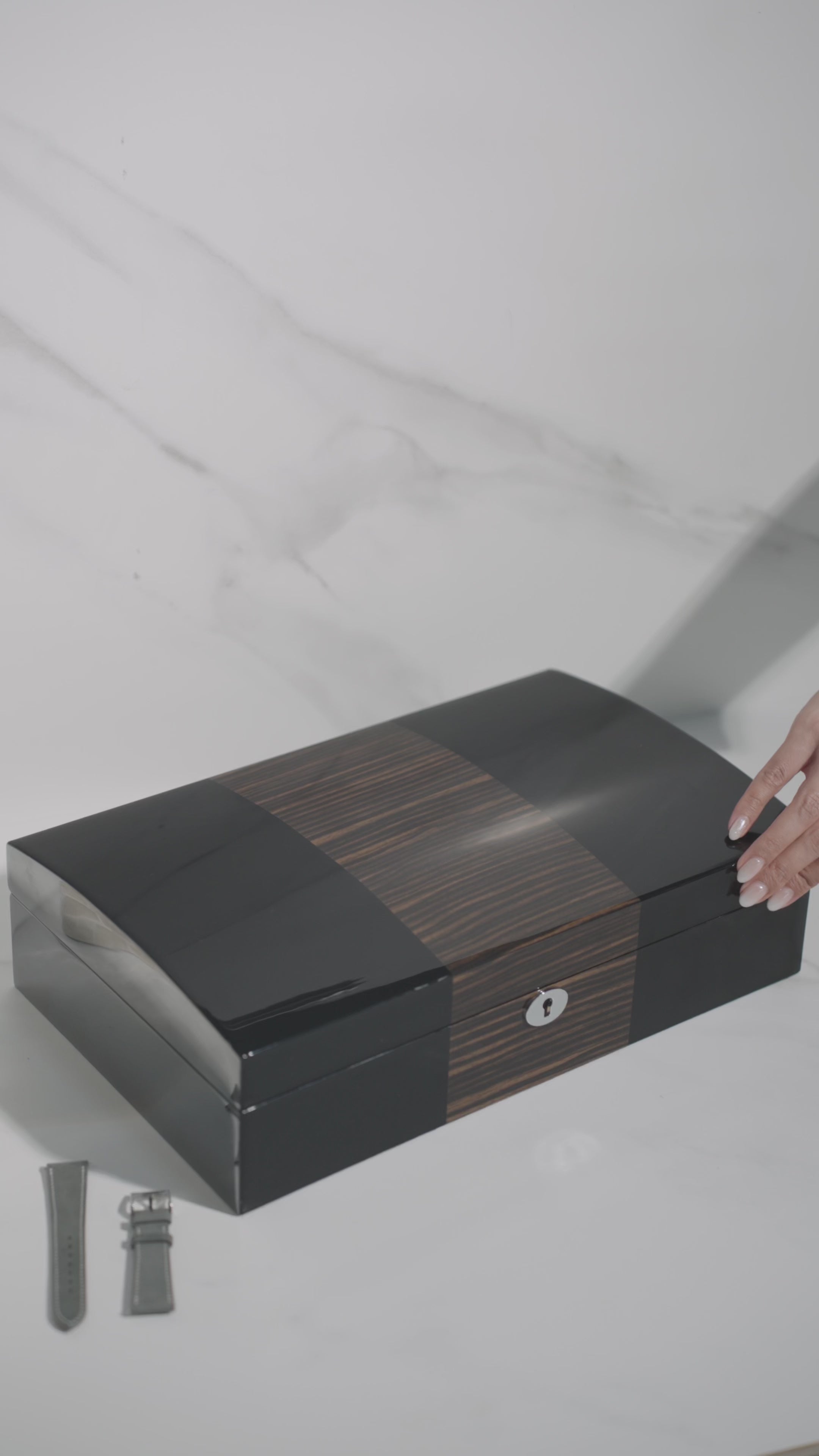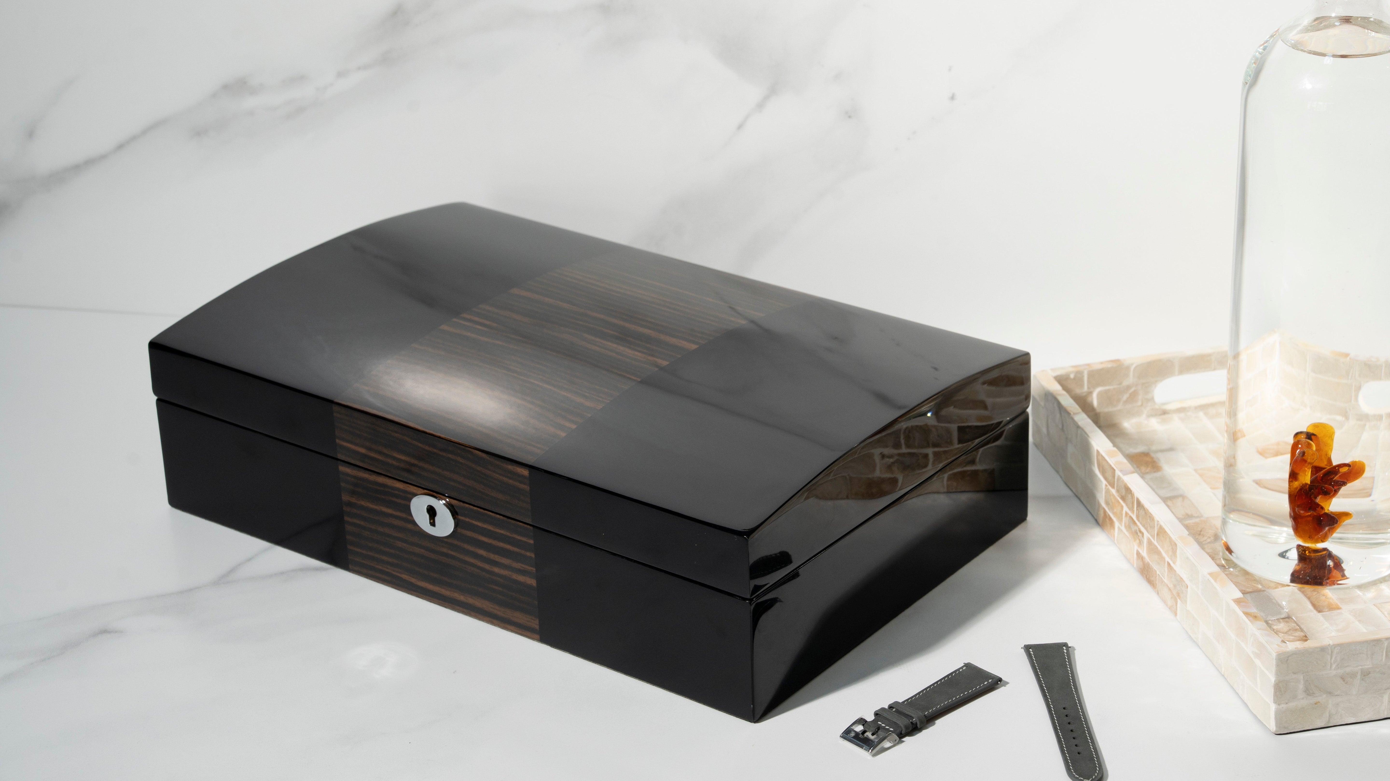As our largest watch box, The Grail stands out with its elegant dual-tone finish. Featuring chrome-finished flush hinges, The Grail has been refined with every detail in mind. Fitted with belted cushions, it offers usability across a large range of wrist sizes.
