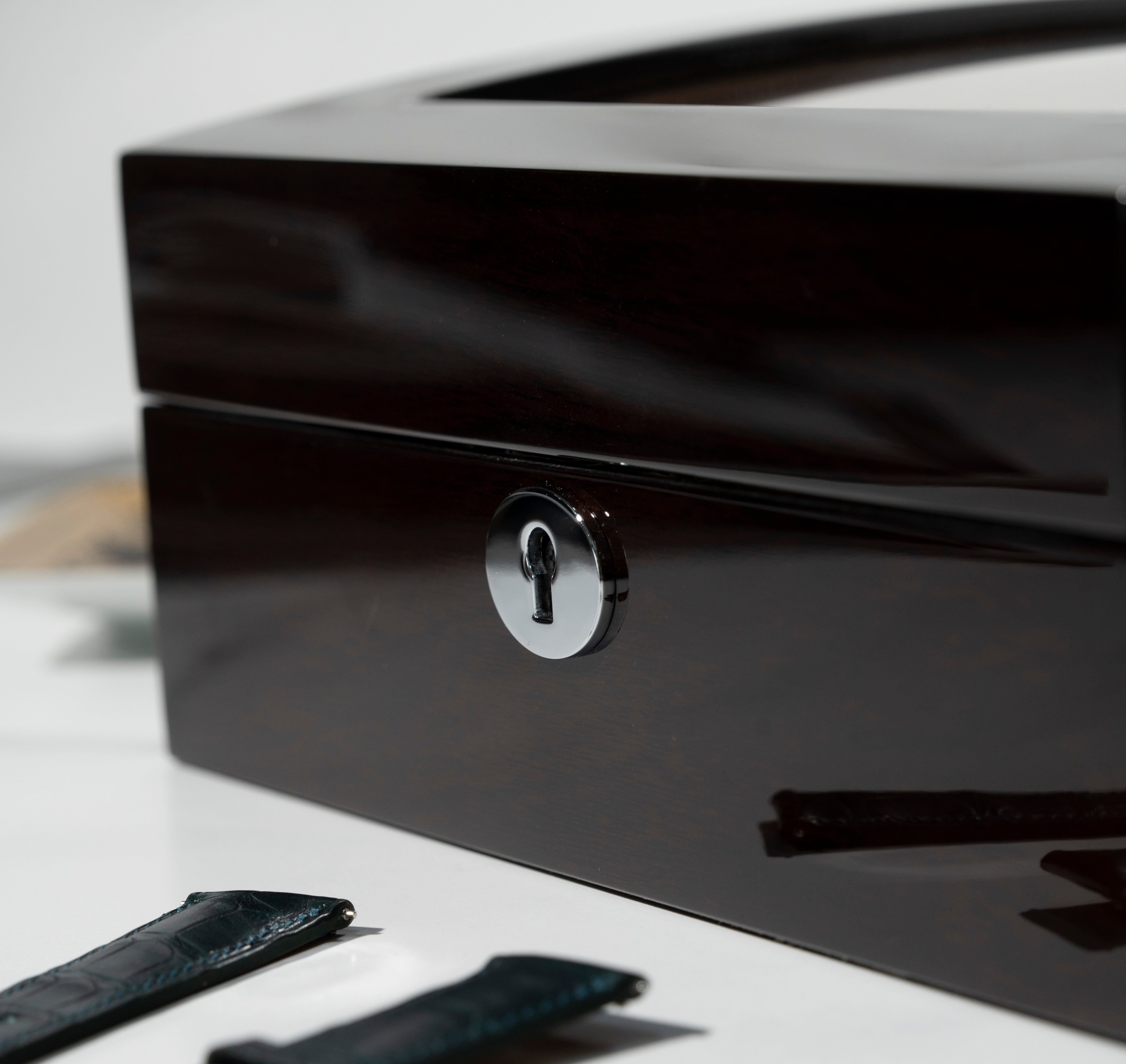 The Panorama features a curvex, tempered glass window. This allows the collector to view their watches with ease. Featuring chrome-finished flush hinges, the Panorama has been refined with every detail in mind. Fitted with belted cushions, it offers usability across a large range of wrist sizes.